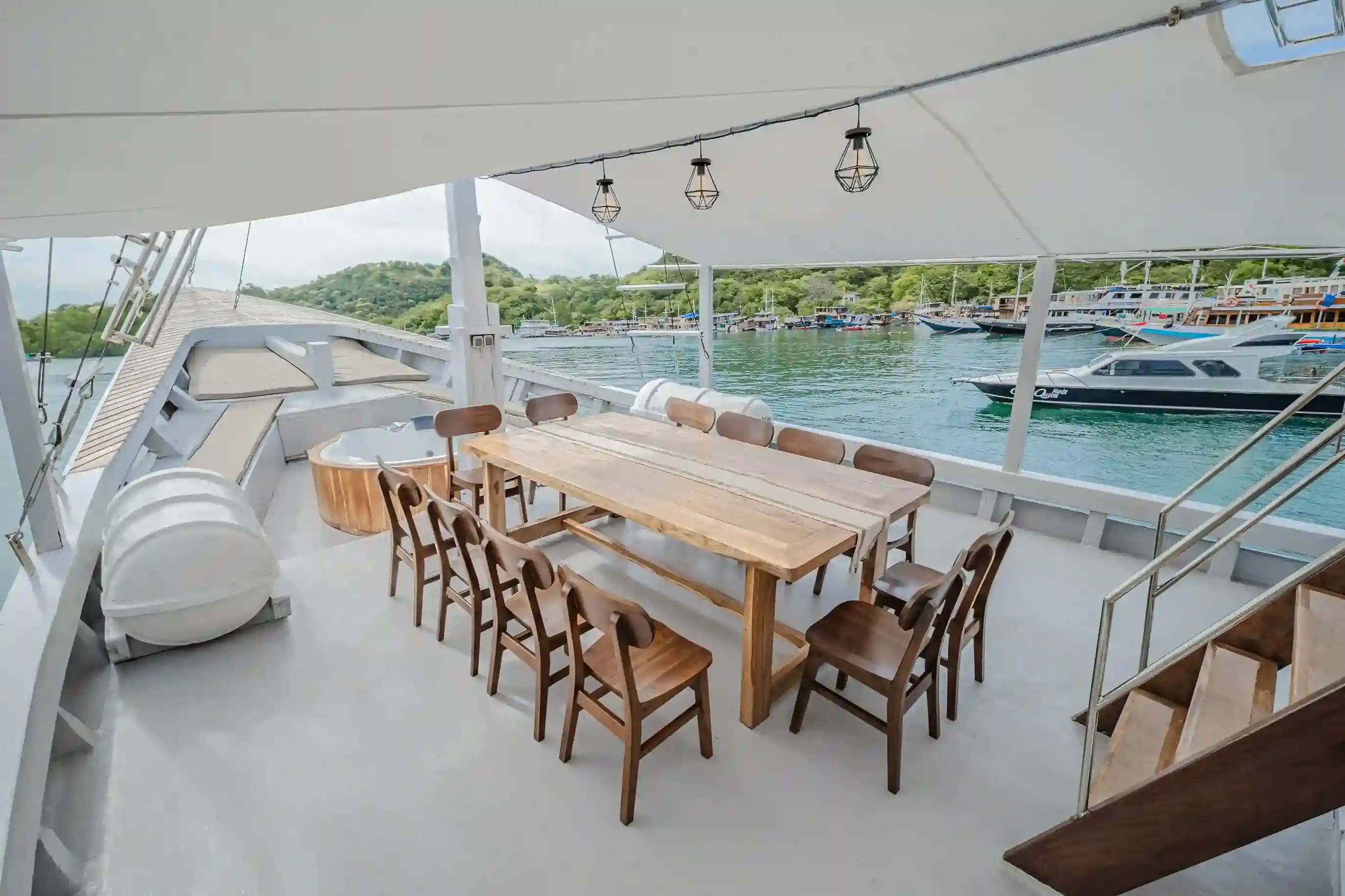 The spacious deck includes a Jacuzzi area for relaxation, an outdoor dining area perfect for alfresco meals, a sundeck area for sunbathing, and an outdoor chill area to unwind while enjoying the stunning views. Ahsana Liveaboard is the ideal choice for travelers seeking a new, solid, and well-designed phinisi boat charter in Komodo, combining authentic Indonesian craftsmanship with modern liveaboard comfort.