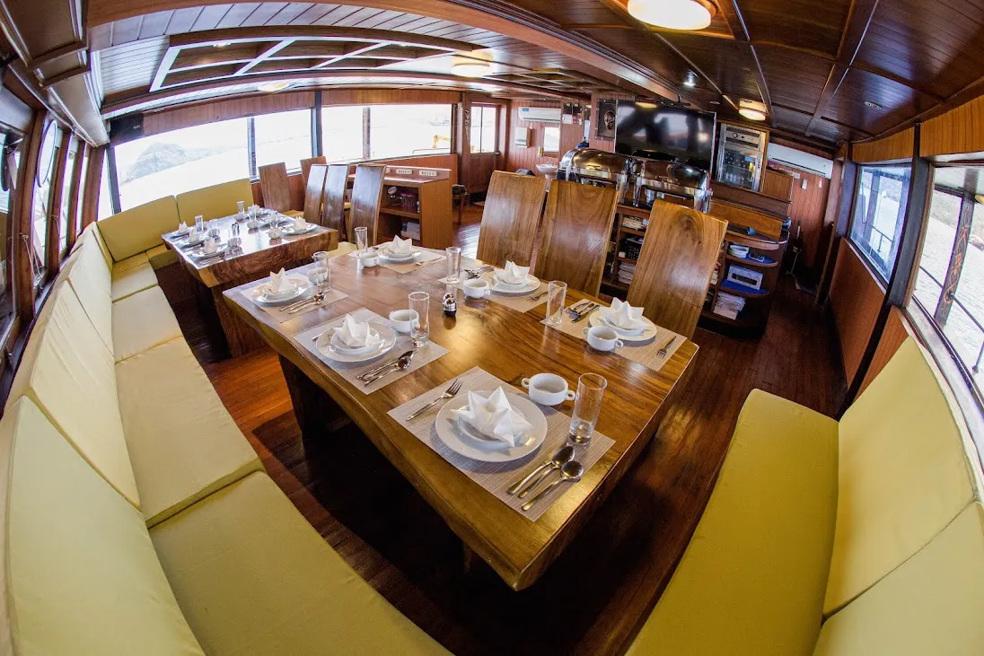 Sea Safari 6 is more than just a boat charter; it’s a home where every detail enhances your expedition. Indoors, the atmosphere blends comfort with convenience, featuring a cozy restaurant and a camera station for photography enthusiasts, ensuring every moment is captured. The dive deck is meticulously organized, catering to both novice and experienced divers, while the ENOS diver locator system adds an extra layer of safety. For relaxation, guests can lounge in both indoor and outdoor sofa areas, unwind on lazy beds, or rejuvenate in the onboard jacuzzi. Additional amenities include a coffee maker, snorkeling gear, kayaks, and board games, making every moment onboard delightful. The boat is also equipped with state-of-the-art navigation and safety equipment to ensure a secure and seamless sea journey through the enchanting waters of Raja Ampat and beyond.