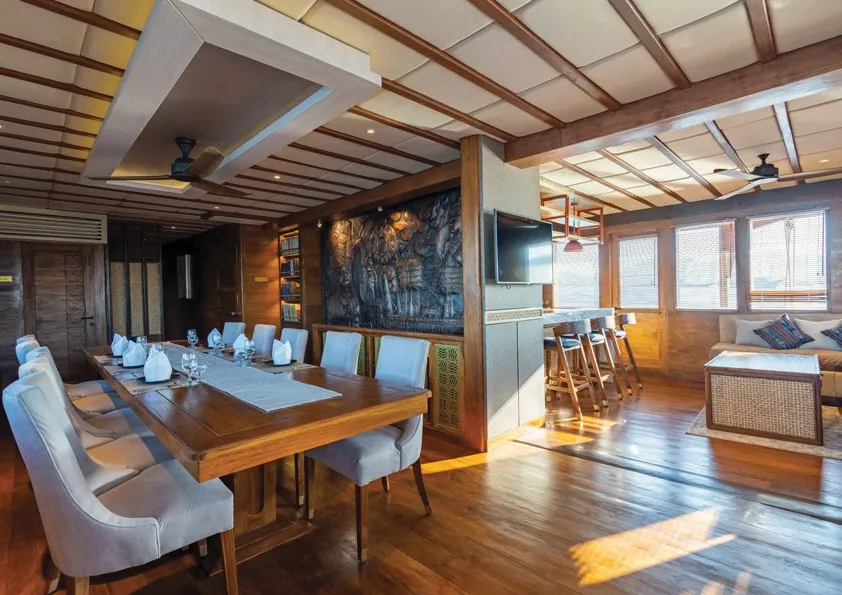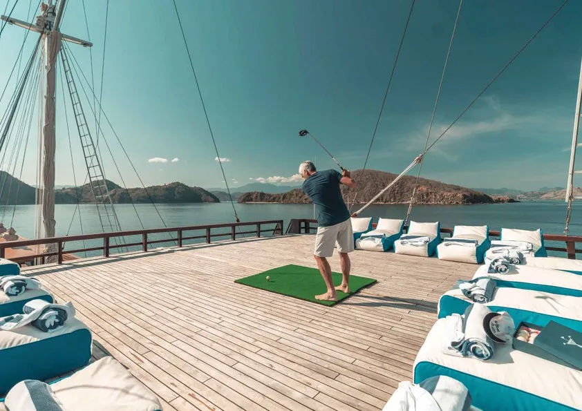 The most emblematic of the main deck area, the Gadjah Mada lounge and dining room, features a large decorative copper bas relief depicting iconic maritime scenes from a bygone era. The shaded lounge areas on the fore and aft decks offer an oasis of calm to relax and bask in the ever-changing scenery. The top deck offers a one-of-a-kind ‘equatorial golf’ experience using biodegradable ecoballs.
